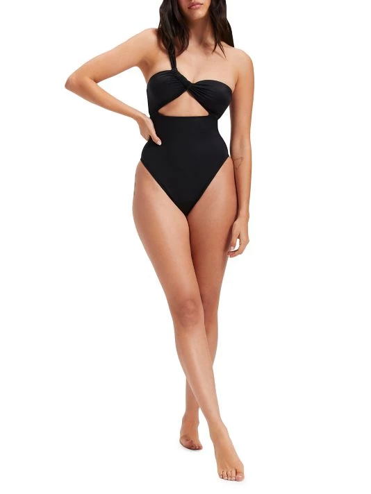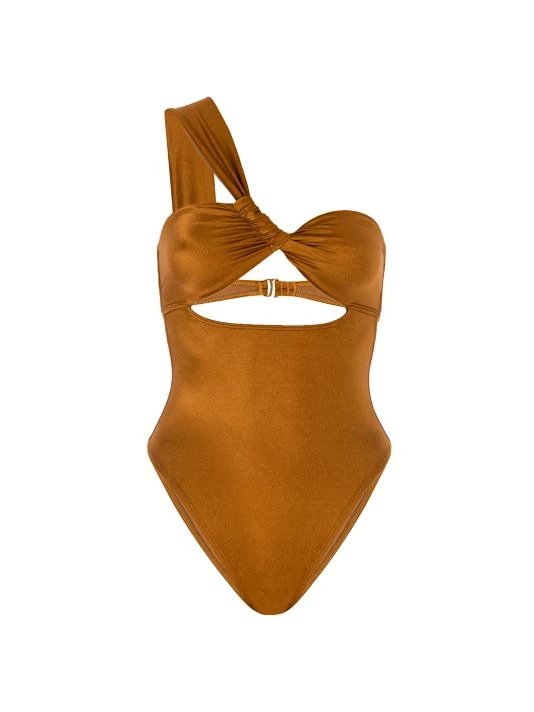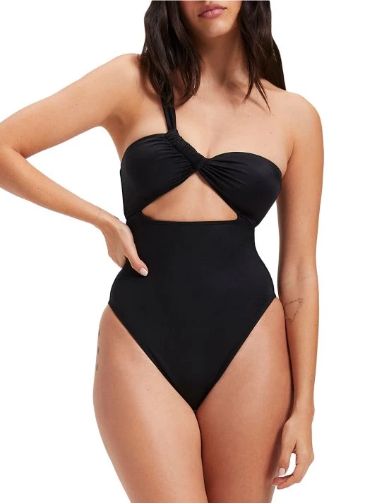 The Bali one-piece swimsuit is designed with a one-shoulder neck and cut-out at the front.