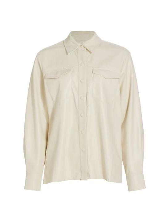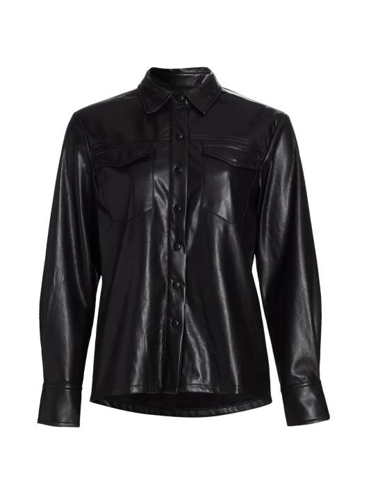 From the Better Than Leather Collection. Crafted of shiny faux leather, this utility-style shirt has all the touches of classic menswear silhouette with spread collar, snap placket and cuffs, and chest flap pockets.