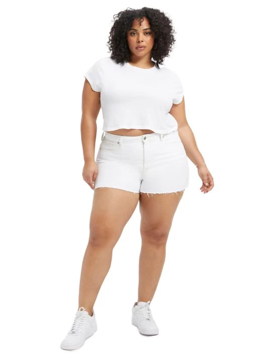 These mid-rise Good ’90S twill shorts from GOOD AMERICAN feature a classic five-pocket design, fitted at the waist and extending to a raw-cut hem.