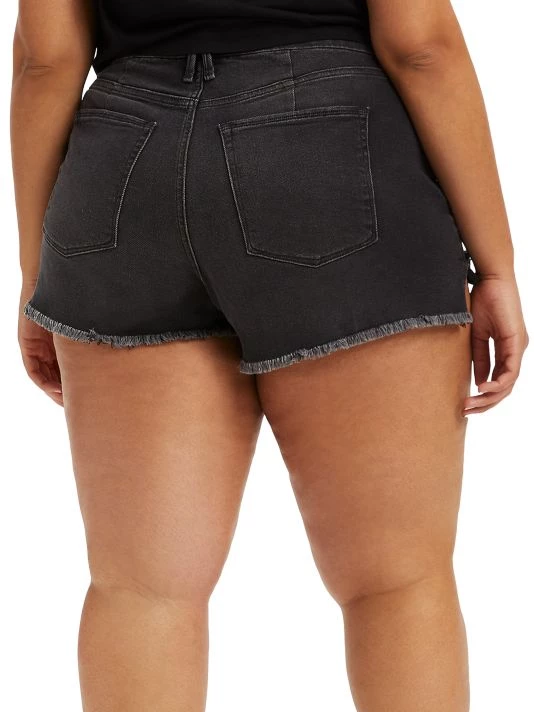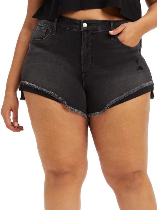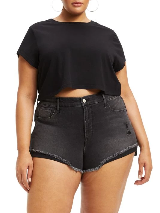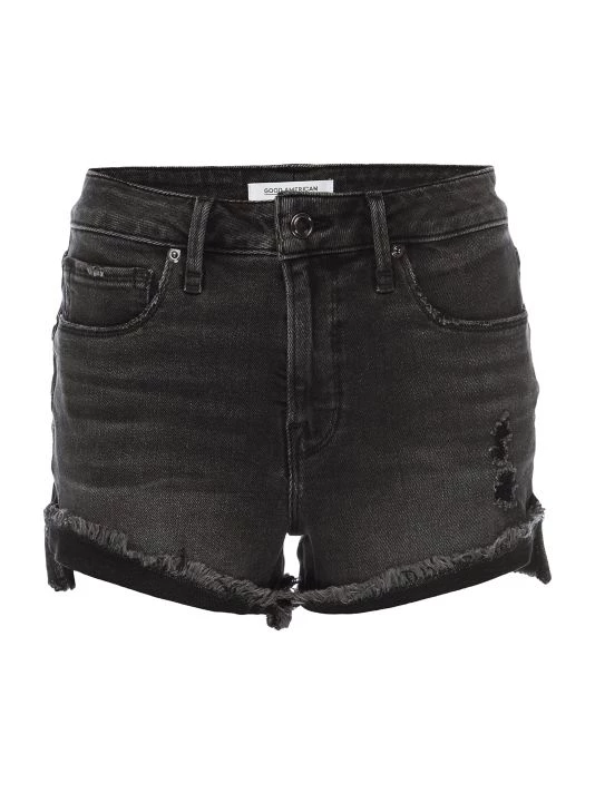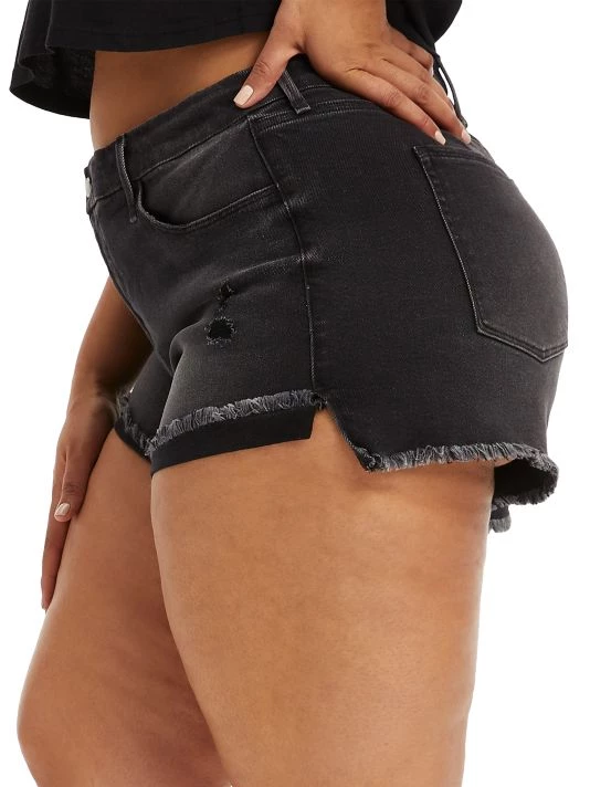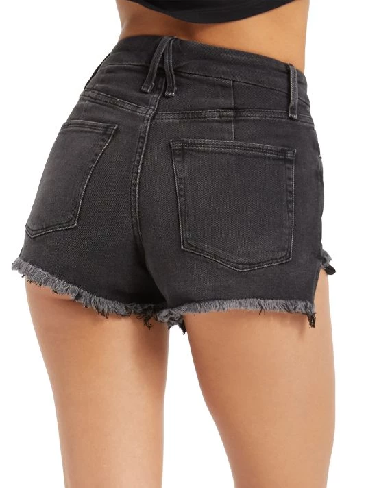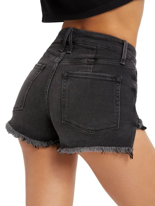 Fitted with a high-rise, these chic denim shorts showcase whiskering and a frayed hem with a split.