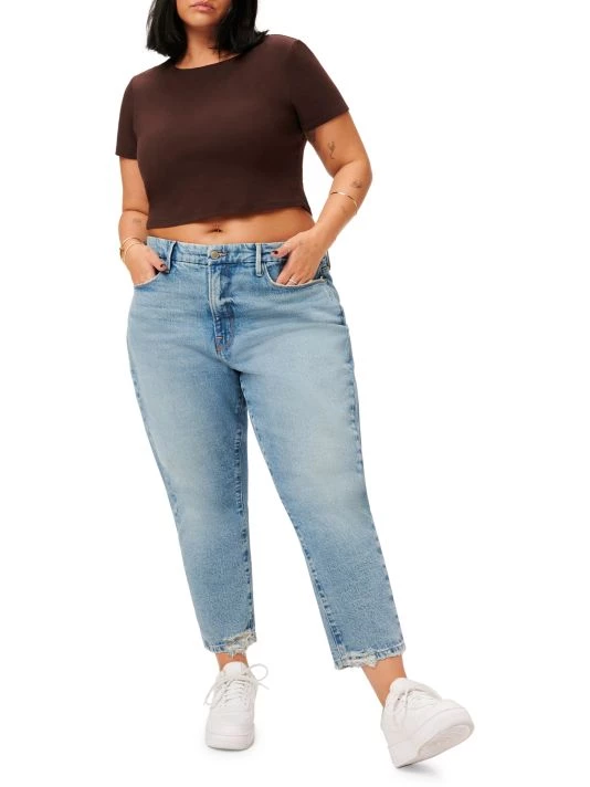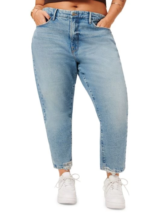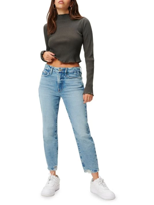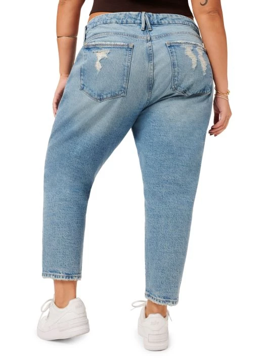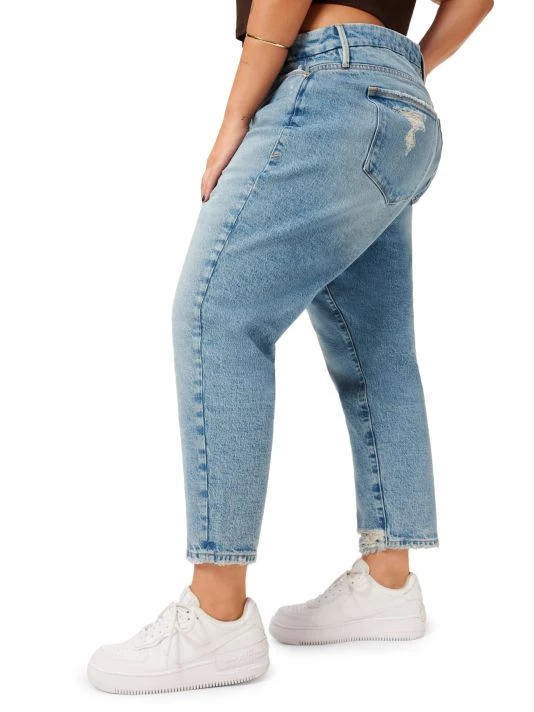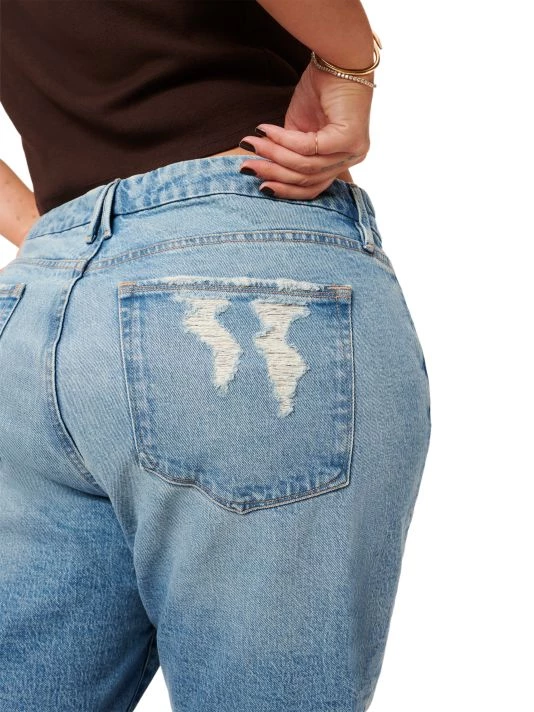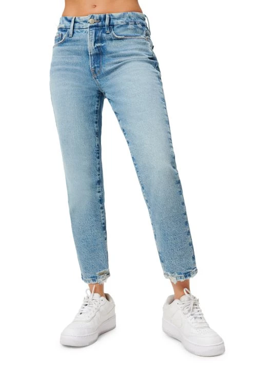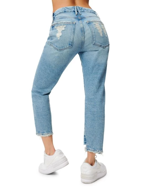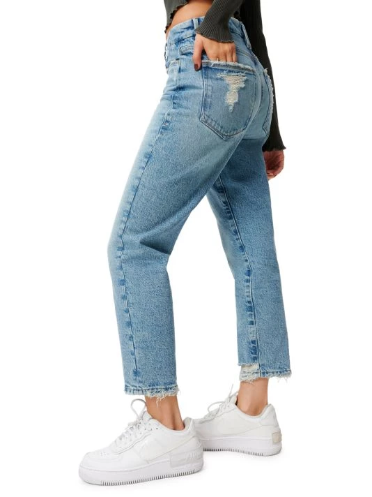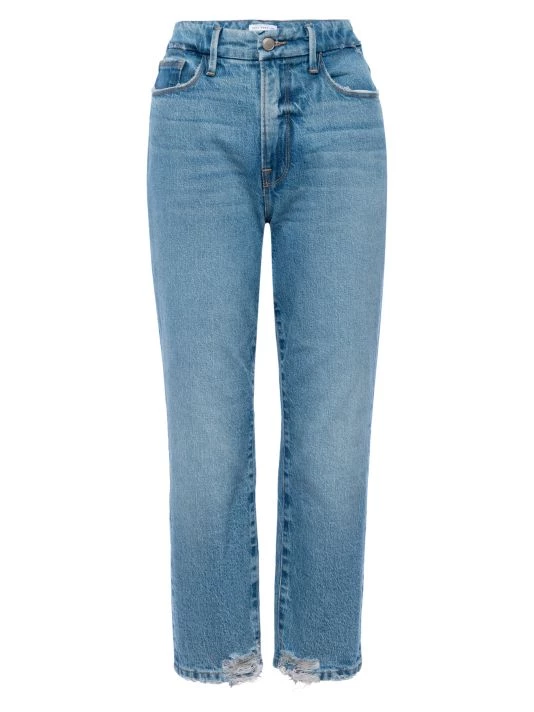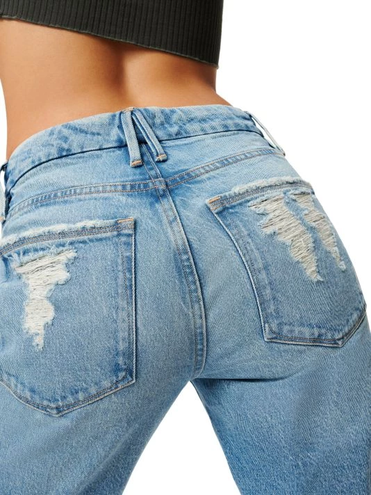 These girlfriend jeans feature a straight-leg fit with distressed back pockets and hem.