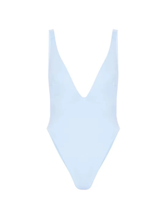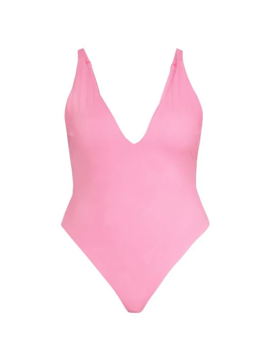 This vibrant one-piece swimsuit gathers at the adjustable shoulder straps, fashioned with a plunging V-neck and high-cut design.