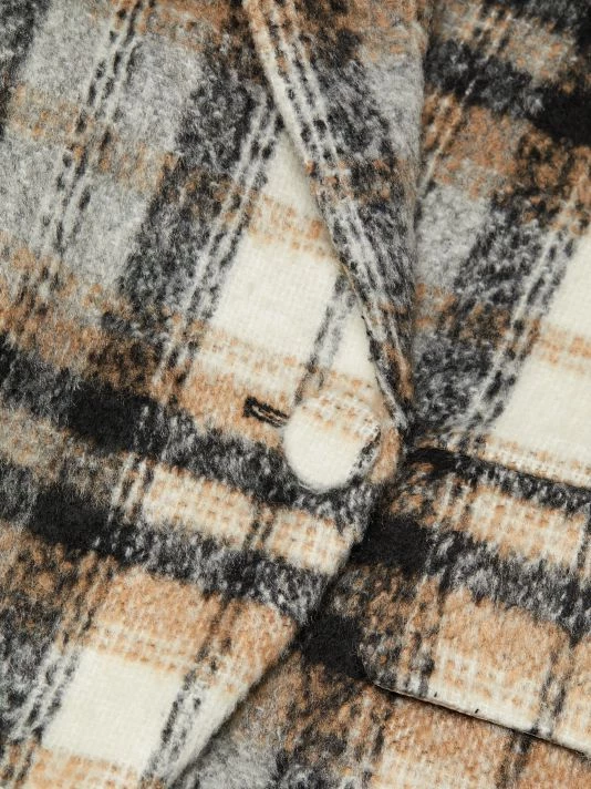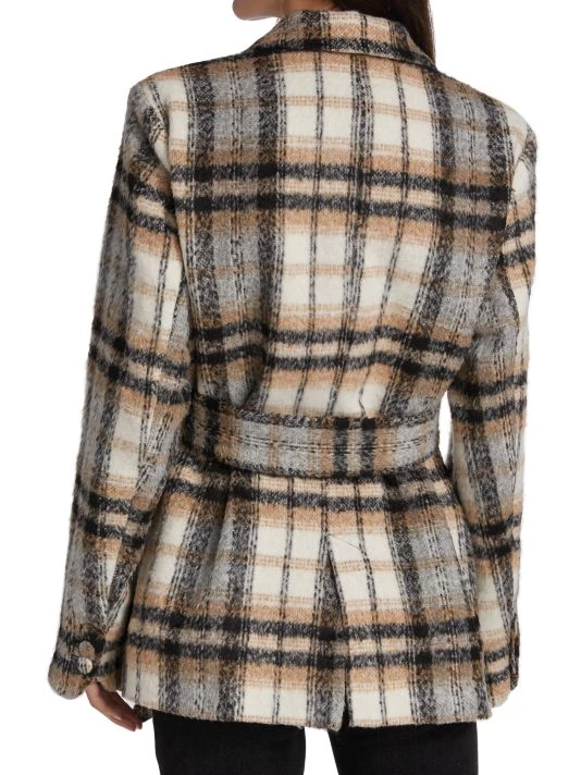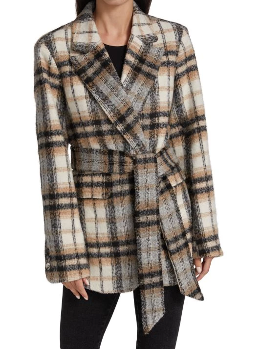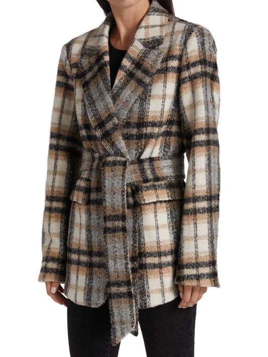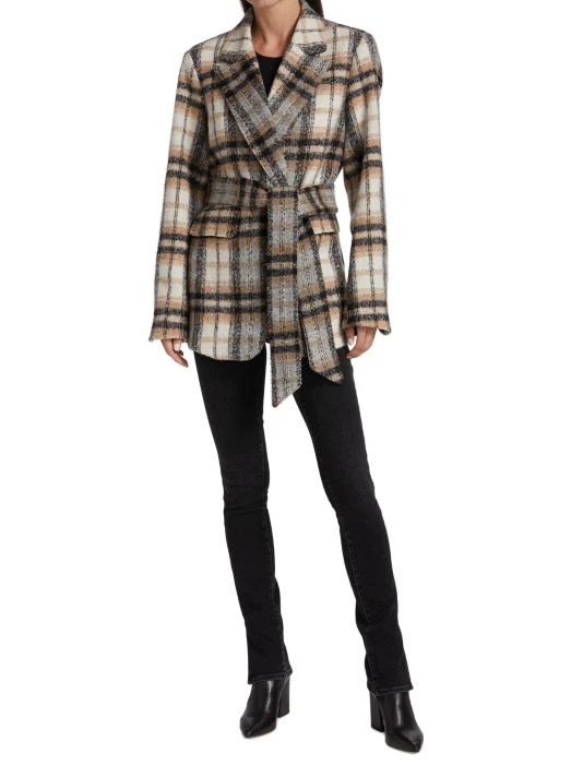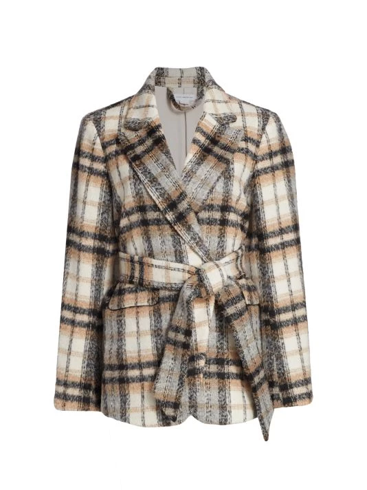 Boxy silhouetted blazer cinches at the waist with a self-tie belt, showcasing a traditional plaid pattern.