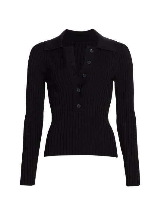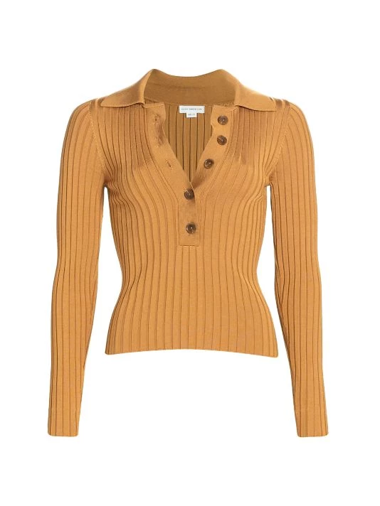 From the Sexy Knits Collection. Adding a touch of sass to the classic polo silhouette, this fitted shirt skims the figure with a flattering rib-knit texture, paired with an optional deep V-neck.