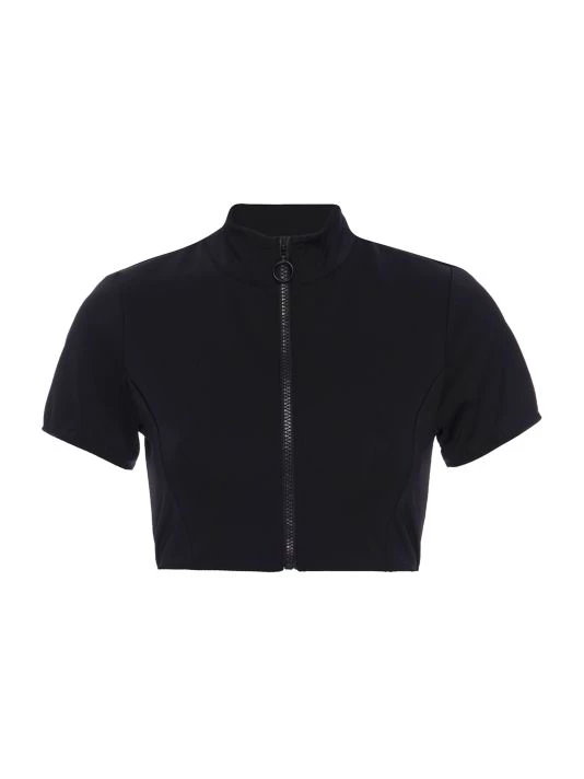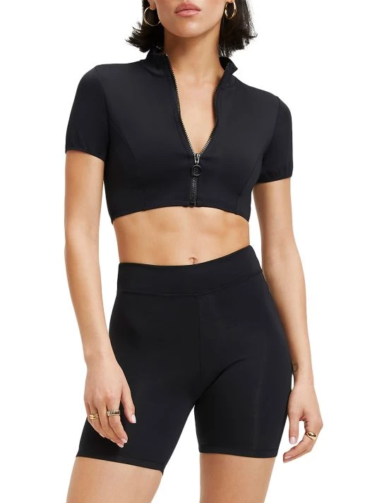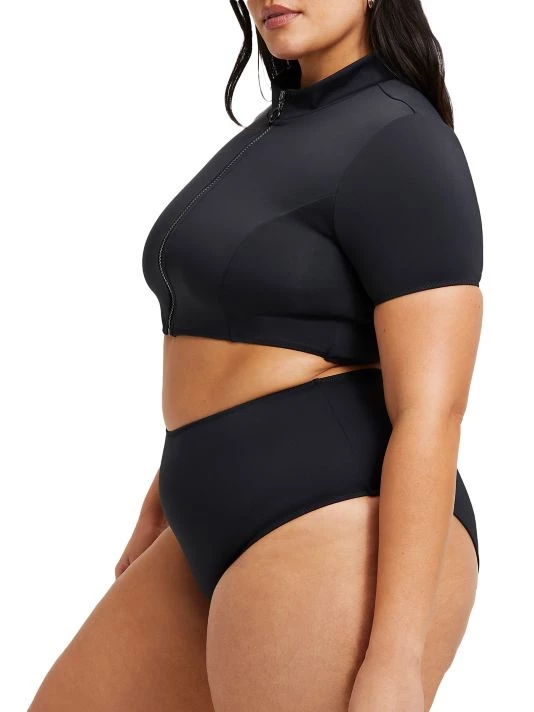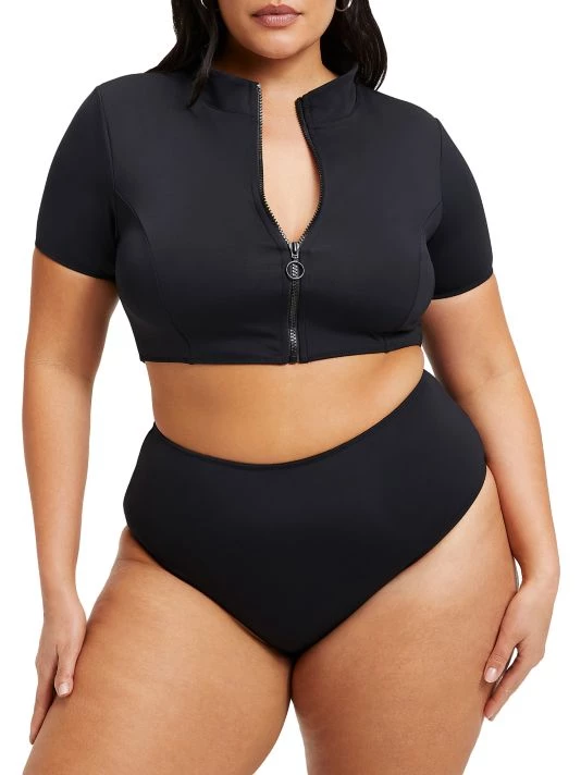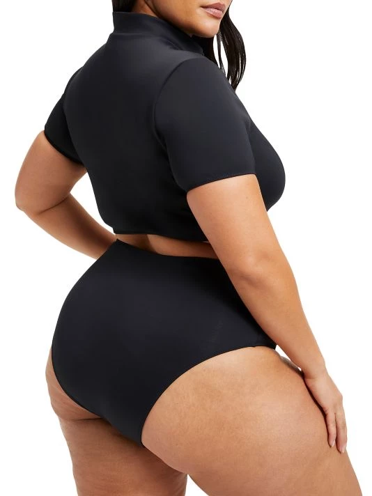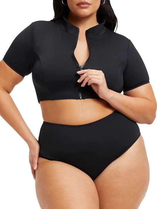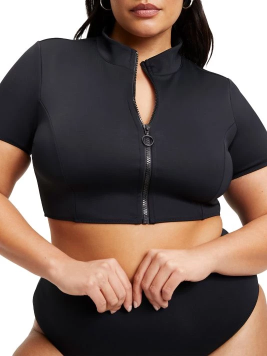 Ideal for surfing, GOOD AMERICAN’s Scuba swim top is a cropped, short-sleeve style with a zip front.